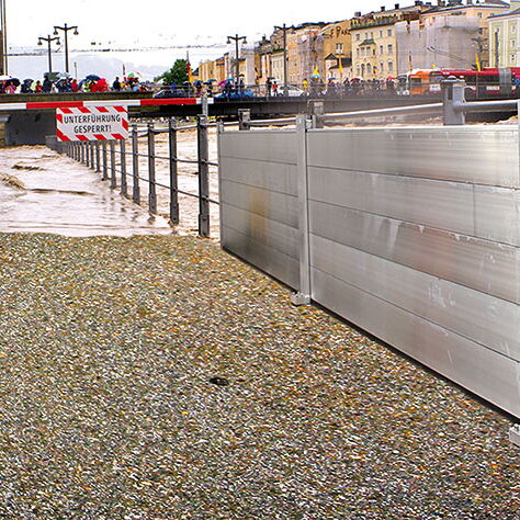 Das mobile Hochwasserschutzsystem aus Aluminium schützt Rampen, Tore und Türöffnungen zuverlässig vor Überschwemmungen. Es kann ausserdem entlang von Gewässern als Linienschutz eingesetzt werden.